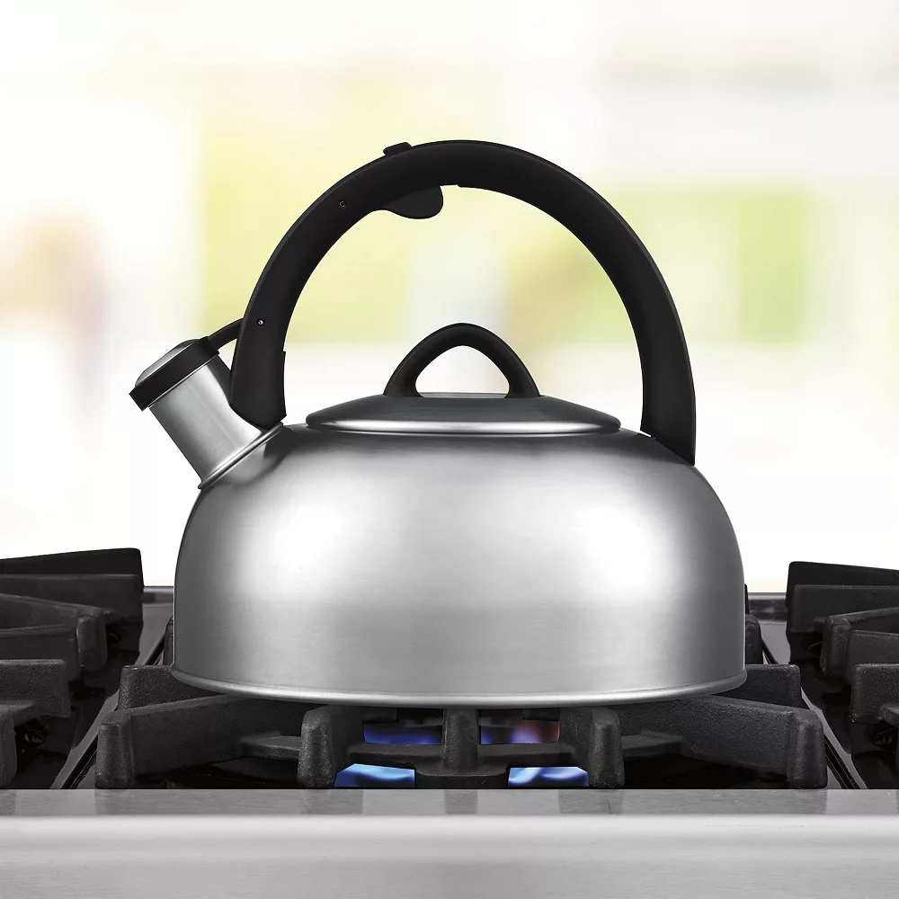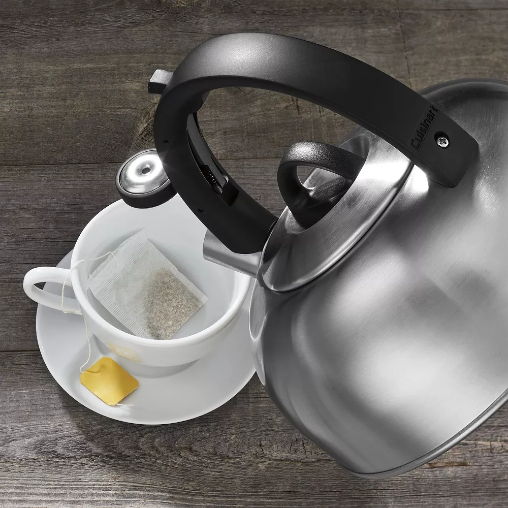 The Cuisinart Classic Brilliance tea kettle makes enjoying tea hassle-free. Its unique handle allows you to open the spout with the touch of your finger, and a pleasant whistling sound reliably signals boiling water.