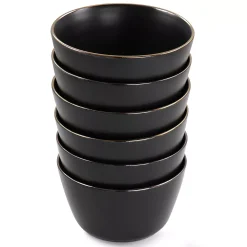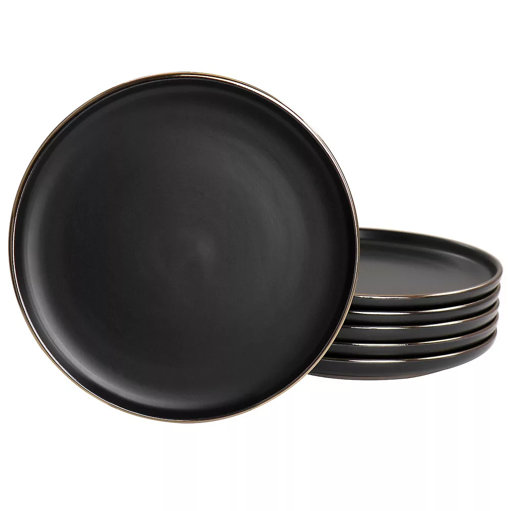 Add a beautiful accent to your dining table with the Elama Paul 6 Piece Round Stoneware Salad Plate Set in sophisticated Matte Black with Gold Rim Trim. Each piece is creatively crafted with a unique flat base, raised rim and trimmed in gold. Beautifully finished off with a thin elegant gold rim, this set is a statement piece. Constructed of Stoneware, these salad plates are ideal for special occasion gatherings and sturdy for every day use. Each plate is microwave safe for quick reheating and dishwasher safe for easy cleaning. Mix an match with new pieces and pieces you’ve collected over the years.