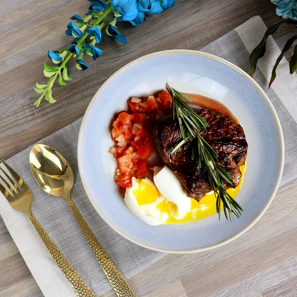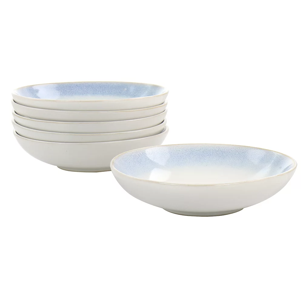 Serve guest with the stunning display of the Martha Stewart Blue Rim 8.25 Inch 6 Piece Stoneware Dinner Bowl Set. These stoneware bowls fashion a natural off white color with a shore like blue gradient that trickles down the interior. The stoneware body gives a satisfying weight to every piece while providing proper durability. For ideal convenience, this bowl set is dishwasher and microwave safe. Enjoy a hearty bowl of oatmeal in the morning, cozy up to some tomato soup, or delight yourself to generous helping of ice cream.