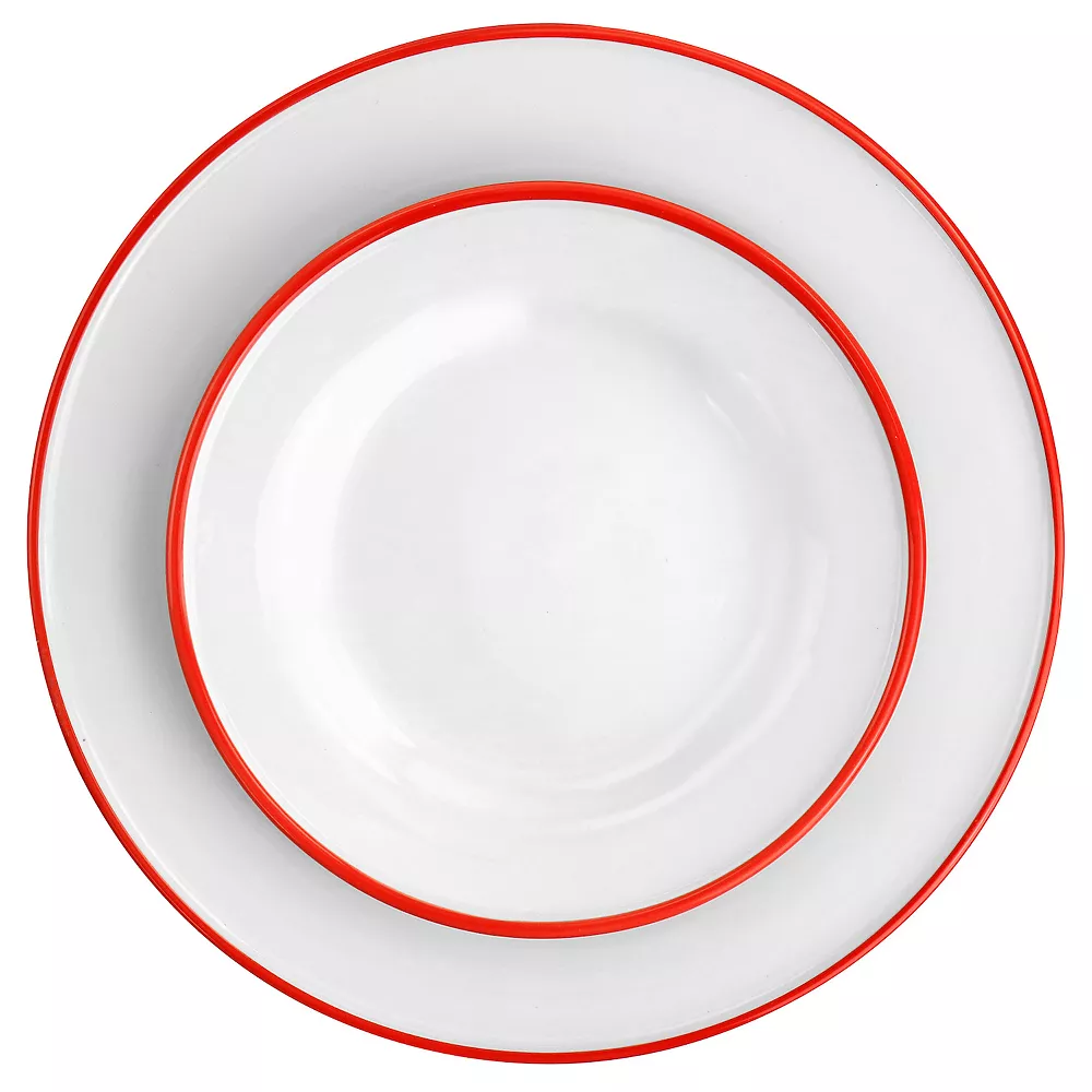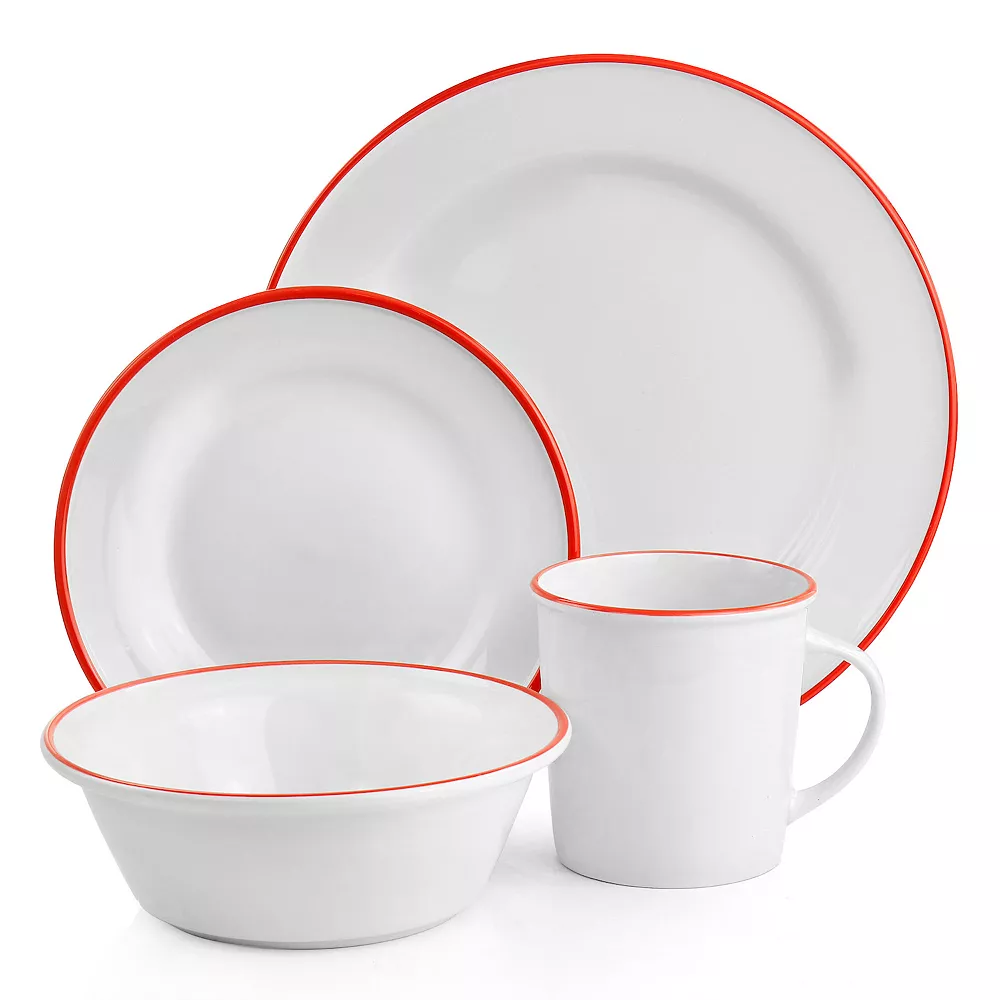Bring a clean modern look with a pop of color to your table with this red rimmed 16 piece dinnerware set by Martha Stewart. The Martha Stewart collection is perfect for formal or relaxed settings; put your unique style on display by mixing and matching this collection of serveware and dinnerware to create tabletops that showcase your recipes and make dining more special. This set is designed with a colored rim to add some interest to your table. Fine ceramic construction is durable, dishwasher, and microwave safe. Set includes service for four, including mugs, salad plates, dinner plates, and cereal bowls.