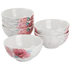 Martha Stewart 6 Inch Fine Ceramic 6 Piece Floral Decorated Cereal Bowl Set In White And Pink